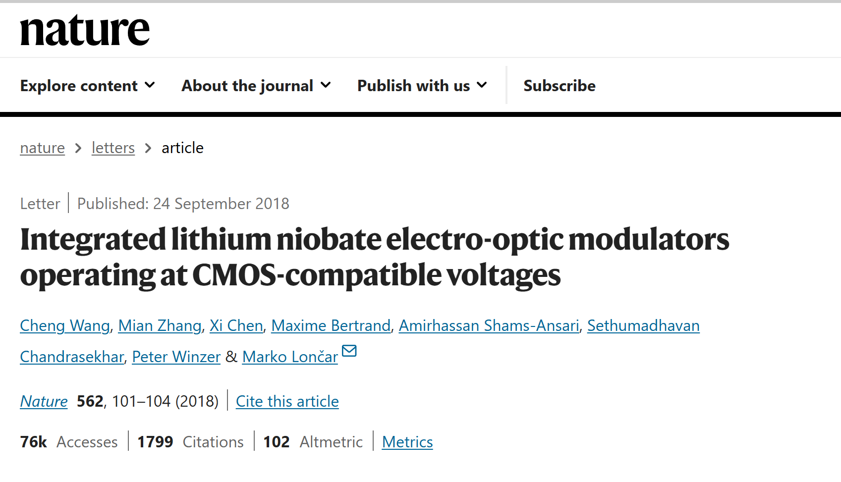 首创CMOS兼容的薄膜铌酸锂调制器,带宽高达100GHz。相关成果发表在 Nature 上,王骋教授为第一作者。