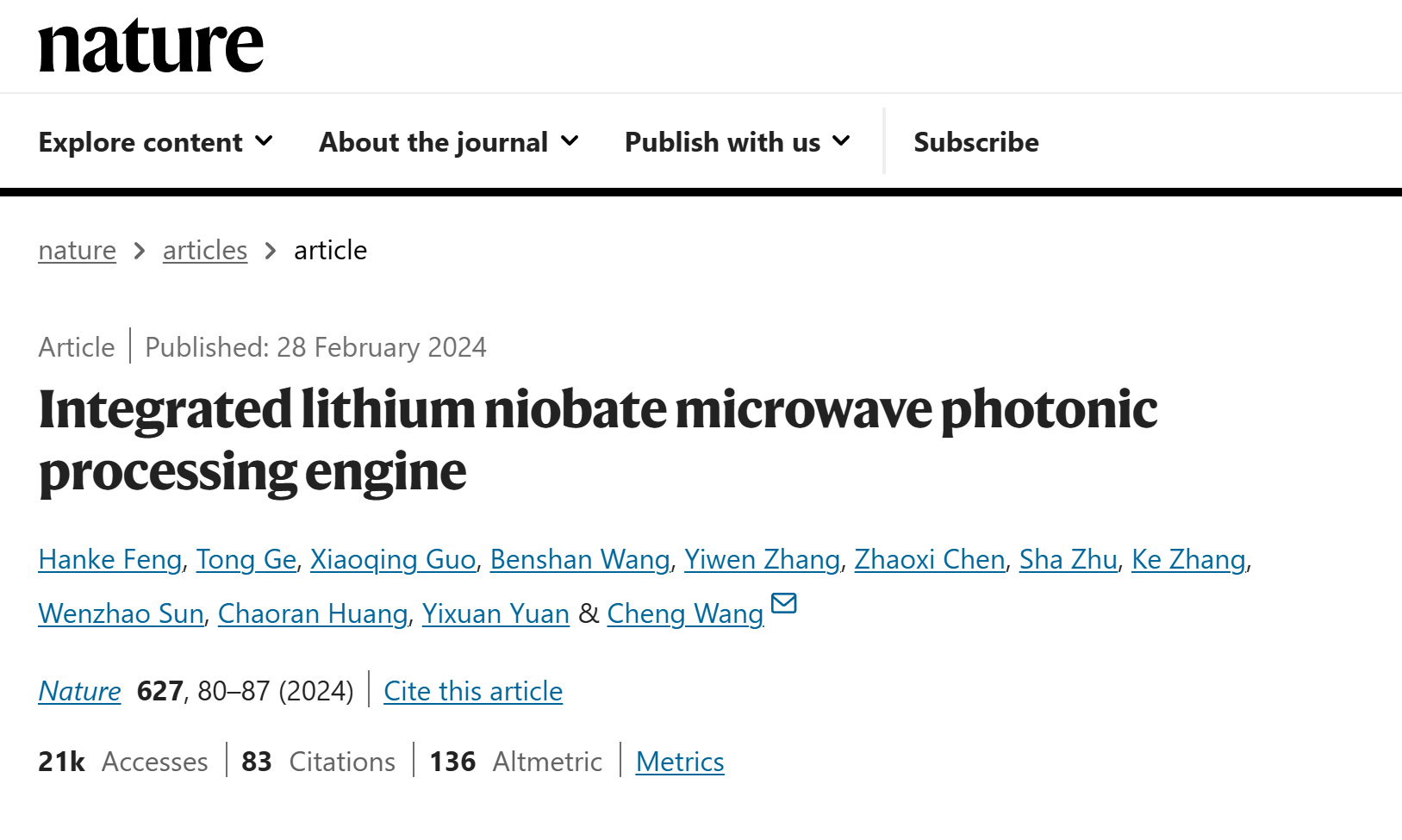 首创薄膜铌酸锂微波光子处理引擎芯片。相关成果发表于 Nature,冯寒珂教授为第一作者,王骋教授为通讯作者。