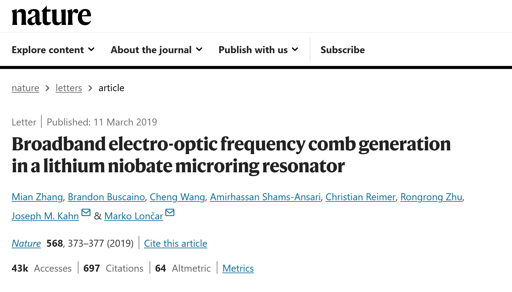 首创基于薄膜铌酸锂谐振腔的电光频梳产生。相关成果发表在 Nature 上,王骋教授为共同第一作者。